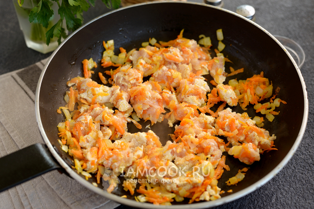 Положите в сковороду куриный фарш, размешайте его вместе с овощами, подержите минуту-другую, до белого цвета.