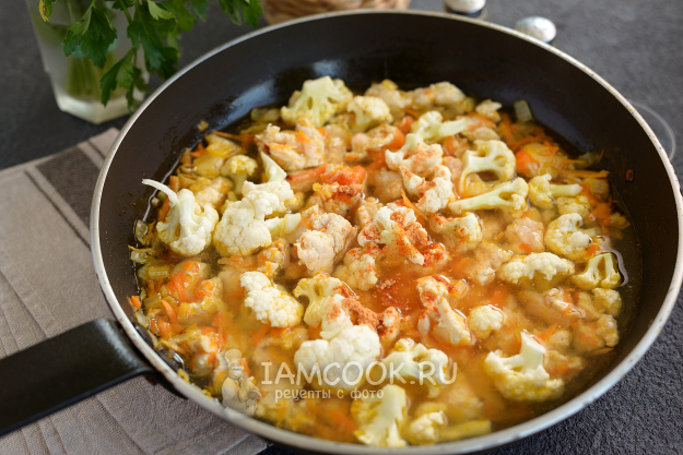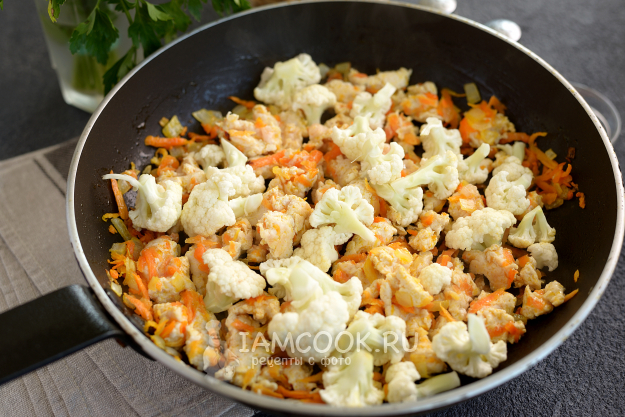 Соцветия капусты разберите на мелкие сегменты, переложите в сковороду.