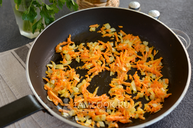 Разогрейте в сковороде немного рафинированного постного масла, обжарьте на нем мелко нарезанный репчатый лук и натертую морковь до сладости и мягкого состояния.