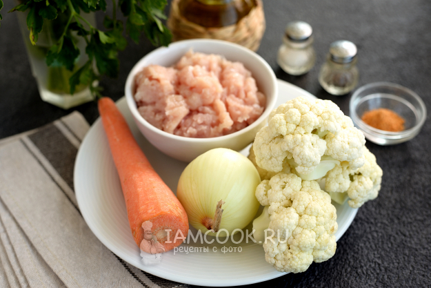 Продукты для приготовления цветной капусты с фаршем на сковороде - перед вами. Цветную капусту разберите на соцветия, лук и морковь почистите. Помойте все овощи под проточной водой вместе с петрушкой. Фарш я покупаю готовый у проверенного продавца, но его, конечно же, можно приготовить и самостоятельно.