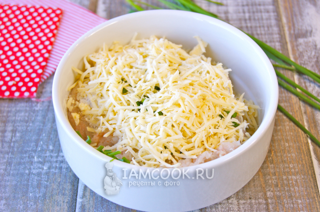 Сыр натрите на мелкой терке и выложите в фарш, тщательно перемешайте.