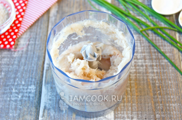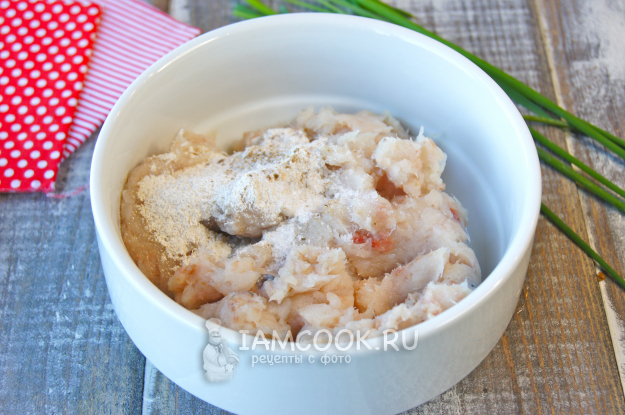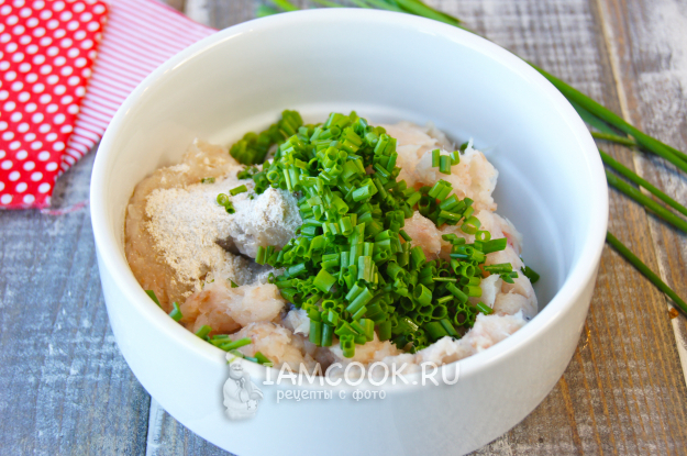 Шнитт-лук промойте под холодной водой. Чтобы избавиться от лишней влаги, встряхните пучок лука, мелко нашинкуйте, затем добавьте в рыбный фарш.