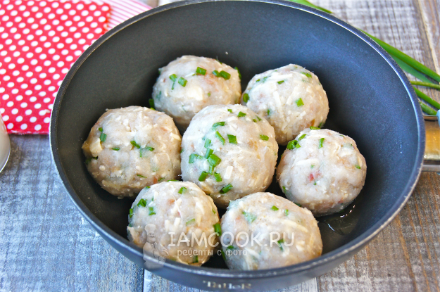 Из готового фарша слепите тефтели желаемого размера, разогрейте сковороду с маслом, выложите рыбные заготовки.