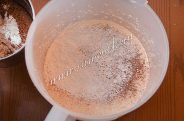 Муку смешать с какао, просеять, добавить в массу, осторожно перемешивая ложкой.