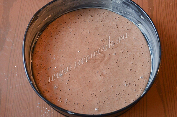 Форму диаметром 23 см. смазать растительным маслом, вылить в нее тесто, разровнять, выпекать в разогретой до 180 градусов духовке 15 минут.