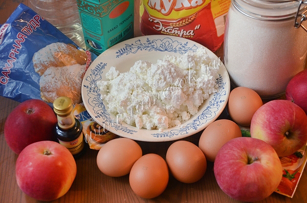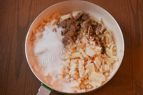 Пока выпекается творожный слой, приготовим яблочный. Яблоки очистить, нарезать небольшими кусочками, сложить в сотейник, посыпав сахаром и корицей. Тушить яблоки на медленном огне, пока они не превратятся в пюре.