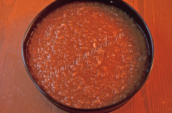 Затем растопить желатин на водяной бане или в микроволновой печи, вылить в яблочное пюре, перемешать, вылить третьим слоем на торт. Поверхность торта разровнять, дать остыть, затем убрать в холодильник минимум на 2-3 часа.