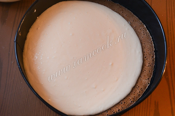 Достать бисквитную основу торта из духовки, вылить на нее творожную массу. Выпекать еще 40-45 минут при 160 градусах. Масса должна схватиться по краям, но немного подрагивать в середине. Достать из духовки, немного охладить.