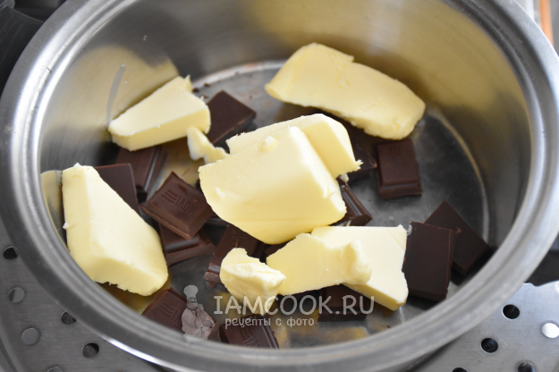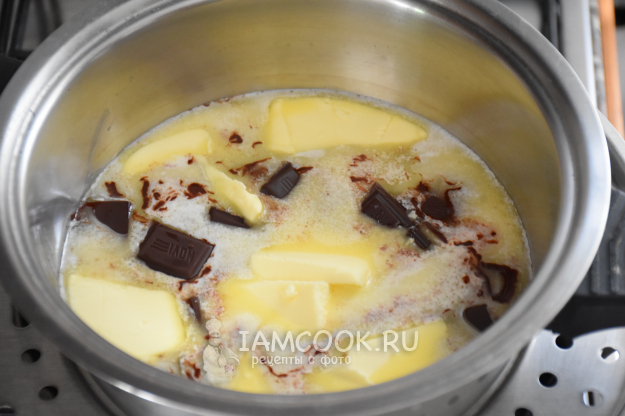 В сотейник с толстым дном положить сливочное масло и шоколад, порезанные на небольшие кусочки.