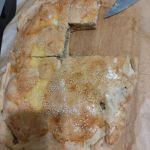 В отложенный желток добавьте 1 ч.л. воды и этой смесью смажьте пирог. По желанию присыпьте кунжутом. В центре сделайте небольшой надрез. Это тесто редко вздувается, но все же.