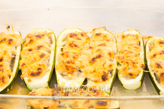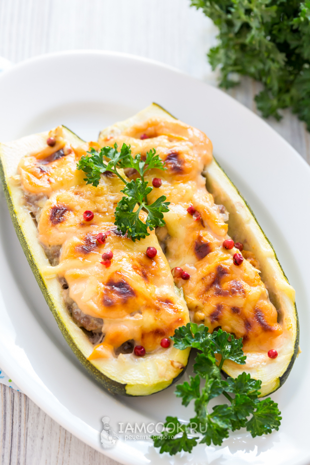 Кабачки с фаршем под сметанно-томатным соусом с сыром готовы.