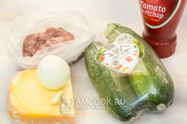 Возьмите продукты для приготовления кабачков с фаршем под сметанно-томатным соусом с сыром. У меня был свино-говяжий фарш, вы же можете взять любой.