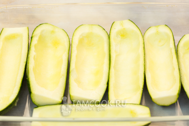 Кабачки разрежьте вдоль, серединку вычистите чайной ложкой: делается это очень просто и быстро.