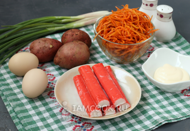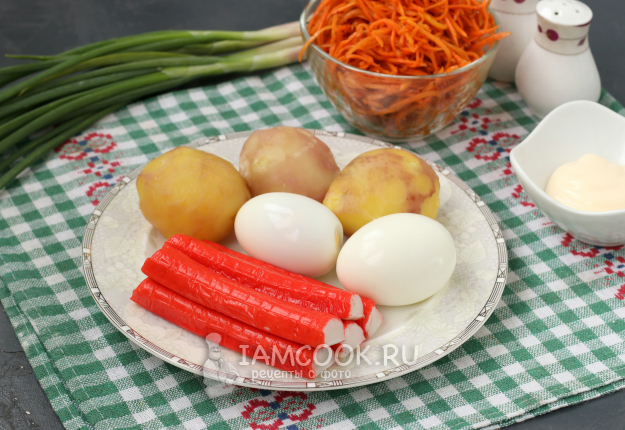Подготовьте ингредиенты для салата с корейской морковью, крабовыми палочками и картофелем.