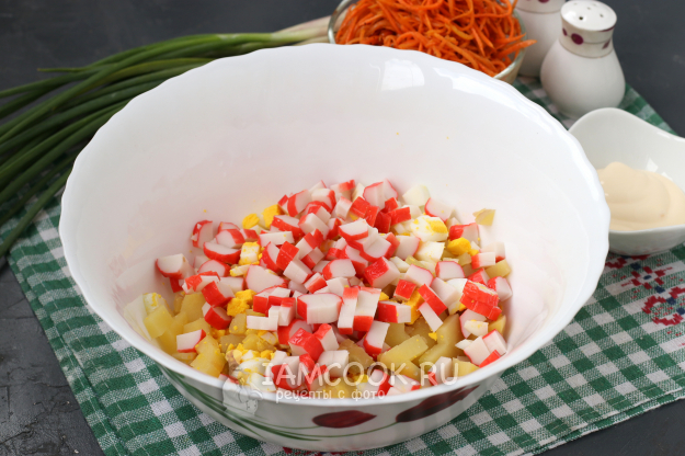 Нарезать кубиками картофель, яйца и крабовые палочки, сложить в глубокий салатник.