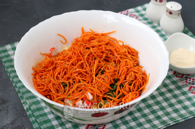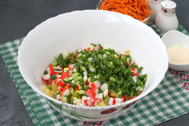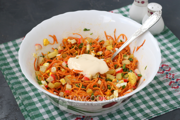 Салат перемешать, заправить майонезом, посолить и поперчить.