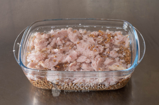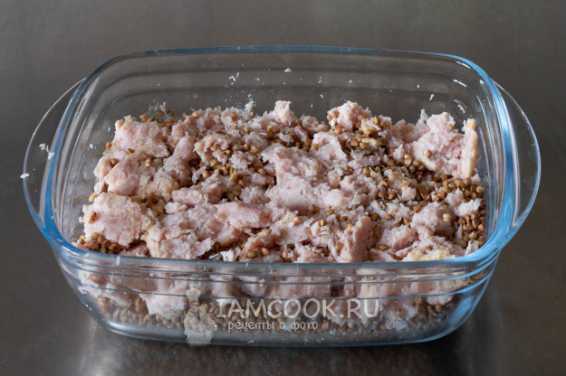 Засыпаем в огнеупорную ёмкость гречневую крупу и перемешиваем её с тушенкой, чтобы последняя оказалась как можно более равномерно распределена по всей площади посуды.