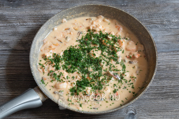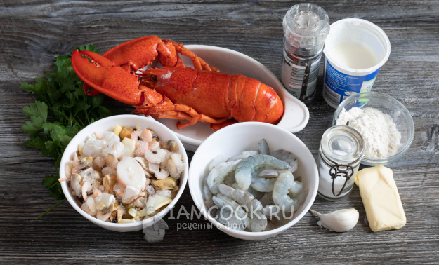 Подготовьте ингредиенты для соте из морепродуктов в сливочном соусе.