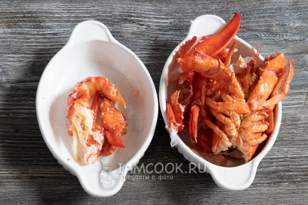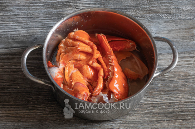 Мясо омара разрезать на небольшие кусочки, предварительно удалив из спины тёмную ниточку кишечника.