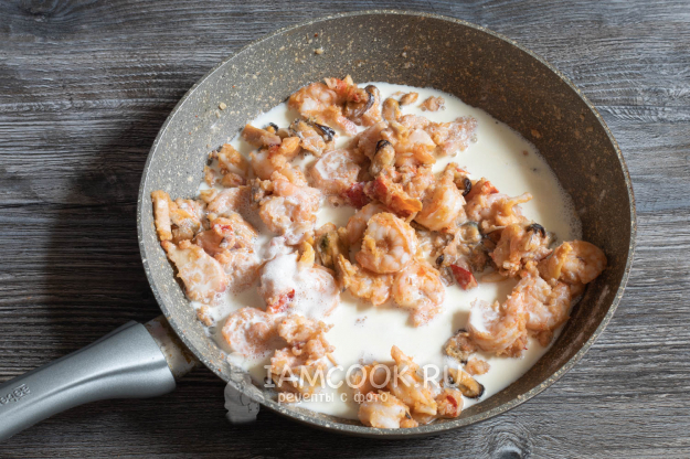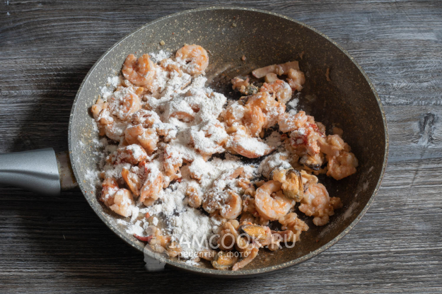 Как только жидкость уйдёт, равномерно посыпать морепродукты мукой, перемешать так, чтобы все они оказались слегка покрыты мукой, и жарить около минуты.