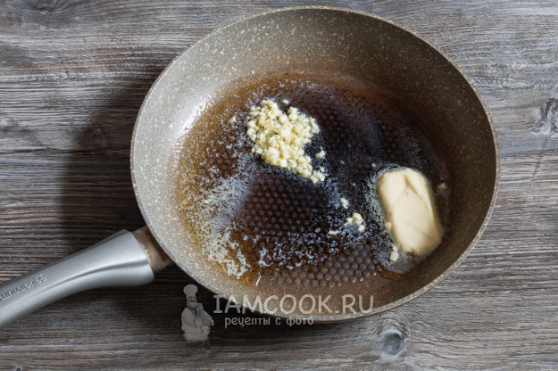 На очень тихом огне слегка обжарить чеснок в сливочном масле. Важно, чтобы они не покоричневели, ни тот, ни другое.