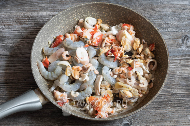 Добавить все морепродукты, перемешать с маслом и чесноком и обжарить на сильном огне до полного испарения жидкости. Для перемешивания можно потряхивать морепродукты на сковороде. Для этого она должна иметь высокие бортики.