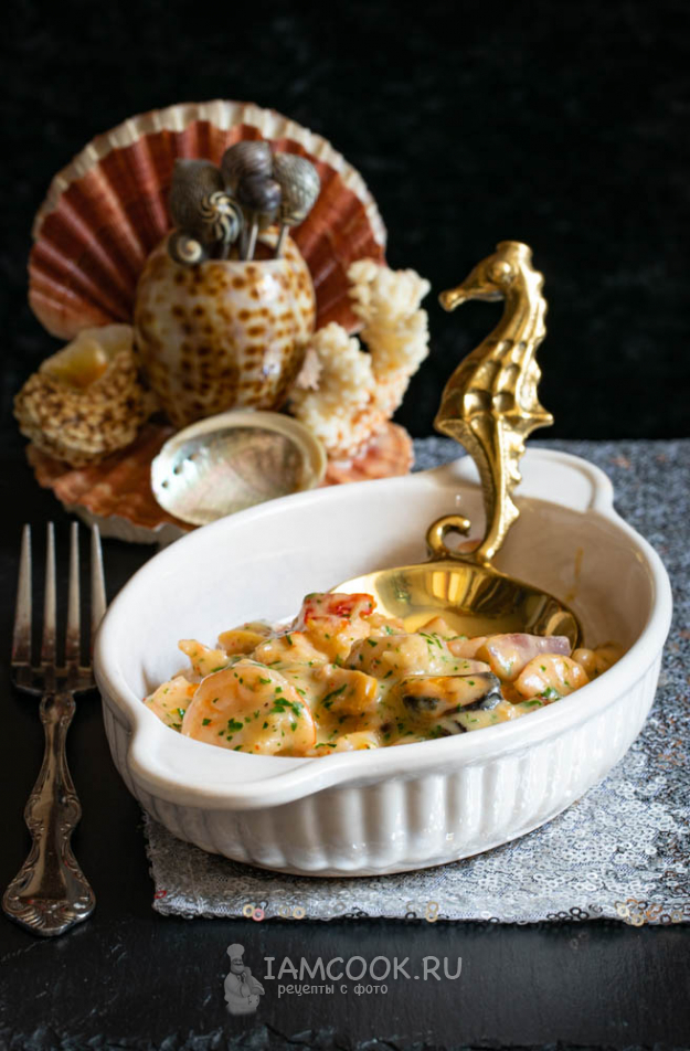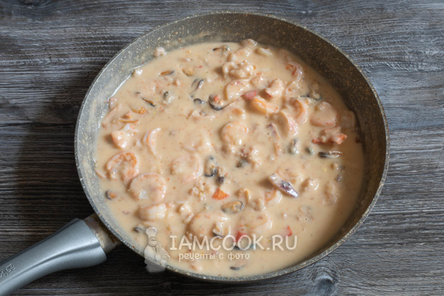 И вот тут-то нам и потребуется бульон, получившийся при вываривании панциря омара. Вливая его в соте с морепродуктами, соус реально довести до желательной для вас степени густоты. Тут единого правила нет, кто-то любит пожиже, кто-то - погуще. Вмешивайте небольшими порциями и смотрите сами.