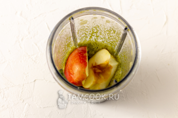Удаляем из яблока сердцевинку, режем яблоки на не очень крупные кусочки. Кладем в чашу блендера и взбиваем.