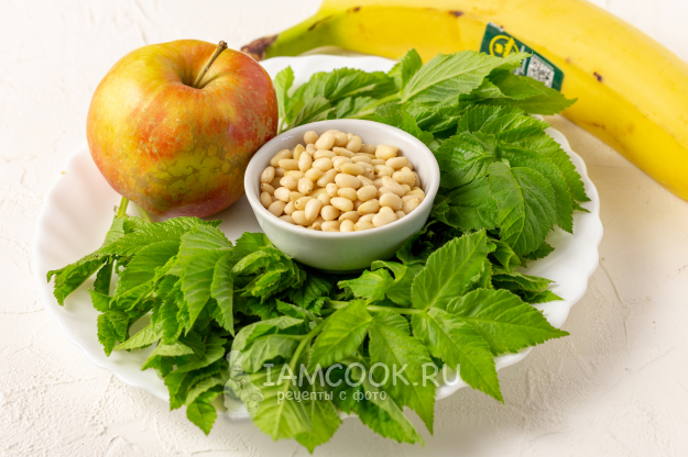 Для смузи из сныти нам потребуются вот такие продукты. Кедровые орешки, если у вас нету, можно и не брать. Но с ними вкус получается более мягким и... сливочным что ли.