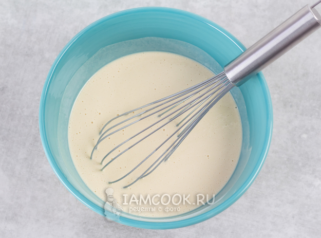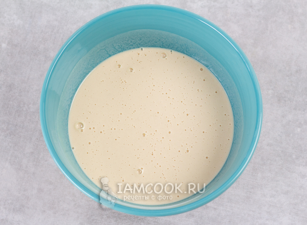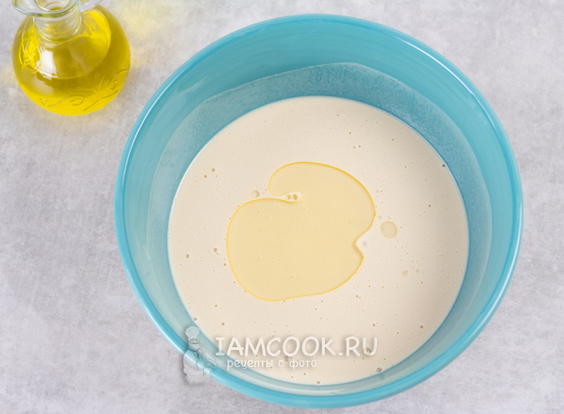 Вмешайте растительное масло. Проверьте консистенцию - тесто должно получиться льющимся, негустым.