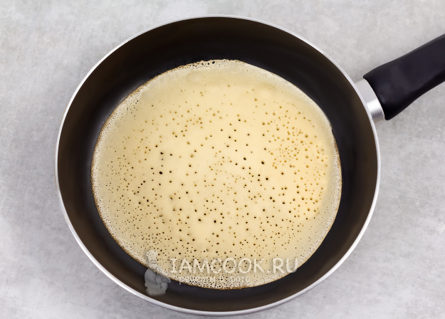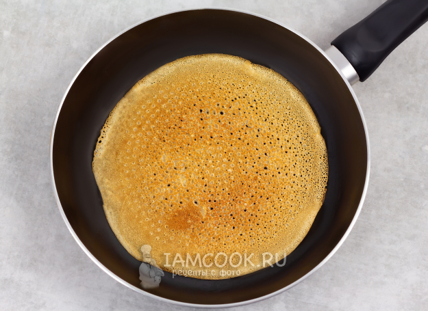 Разогрейте антипригарную/блинную сковороду на сильном или чуть ниже огне, и кисточкой смажьте тонким слоем растительного масла. Влейте первую порцию теста (примерно 1/3 половника) и равномерно, тонким слоем распределите по сковороде, наклонив сковороду под небольшим углом. Обжарьте получившийся блин несколько секунд, пока поверхность теста не станет матовой, а края - чуть золотистыми.