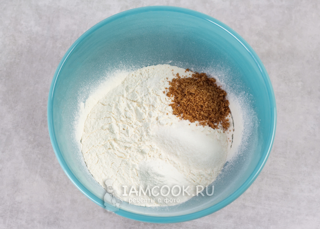 Просейте в миску пшеничную муку. Добавьте сахар, соль, ванильный сахар и разрыхлитель. Перемешайте, для того чтобы все добавки равномерно распределились.