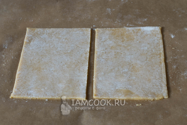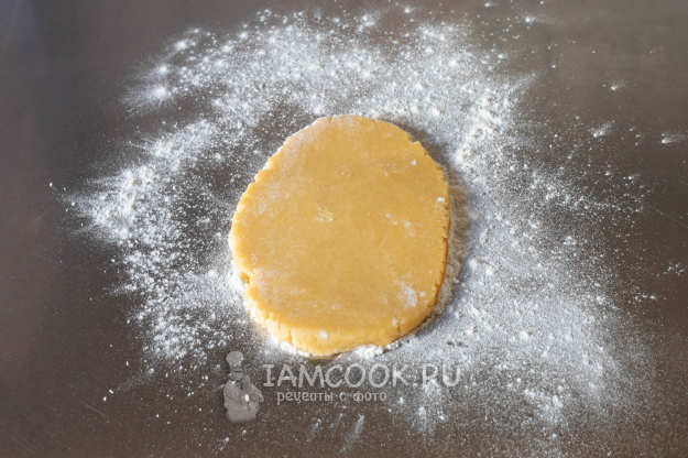 На обильно обсыпанной мукой поверхности как можно тоньше раскатываем песочное тесто (его поверхность тоже должна быть хорошо покрыта мукой).
