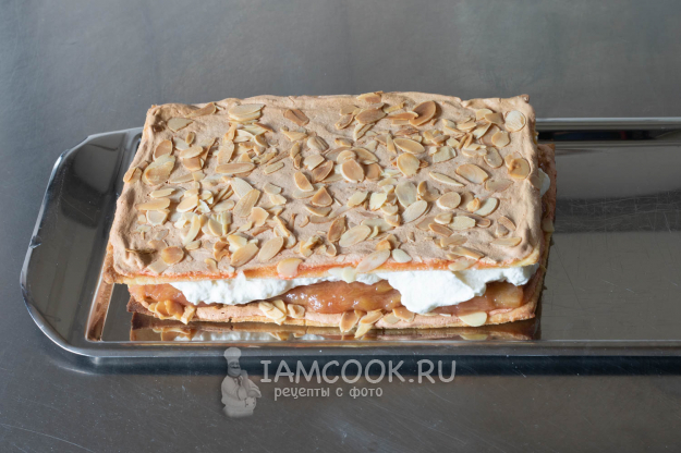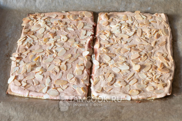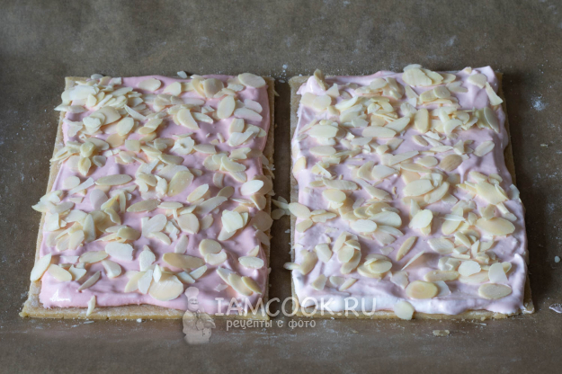 Оба коржа густо посыпаем лепестками миндаля.