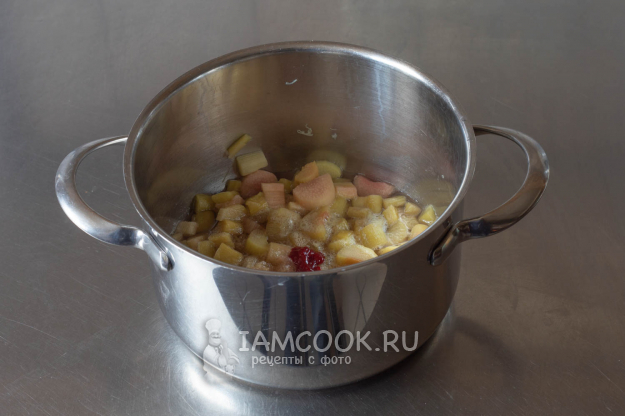 Добавляем оба вида сахара и варим ревень на слабом огне под крышкой, хорошо промешав с сахаром, 5-10 минут с момента закипания. Меньше термическая обработка - кусочки останутся более каркасными; больше разварятся - структуры кусочков видно уже не будет. В конце приготовления можно подкрасить варёный ревень оранжевым пищевым красителем. Ему нужно дать полностью остыть.