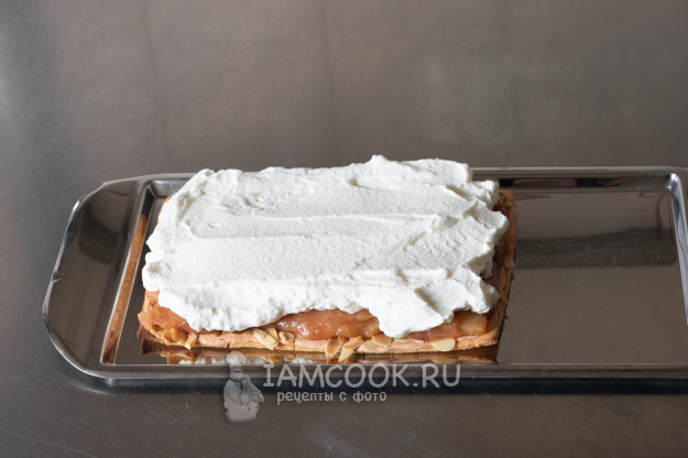 Покрываем белковым кремом песочные коржи, слегка разравниваем крем влажным шпателем, ножом или тыльной стороной столовой ложки.