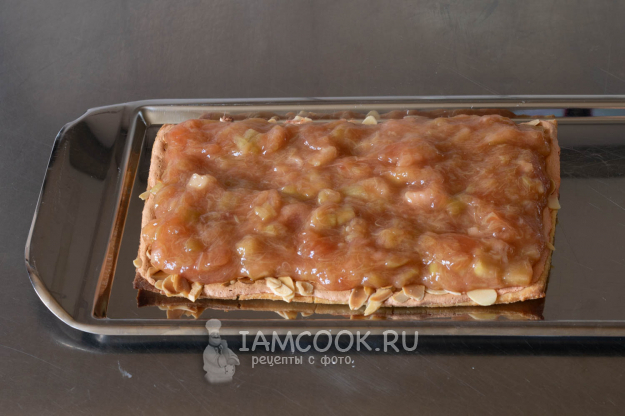 Ещё горячим ревенем покрываем один из коржей и даём ему полностью остыть. В конце остывания можно даже подержать корж с ревенем в холодильнике.