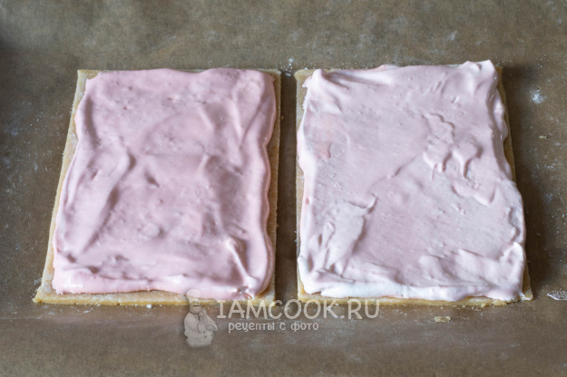 Переносим тесто, пока его ещё реально перенести, на кондитерскую бумагу, и ещё немного катаем на ней. Толщина пласта должна быть лишь 1-2 миллиметра. Вырезаем два коржа одинакового размера. Они не должны соприкасаться краями.
