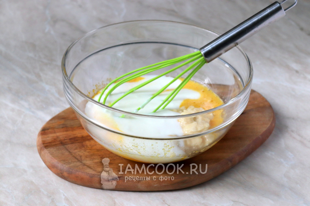 Получившуюся кашицу переложите в миску с яично-сахарной смесью и влейте тёплый йогурт. Перемешайте.