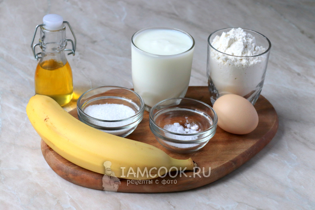 Для приготовления панкейков на йогурте с бананом подготовьте продукты по списку ингредиентов.