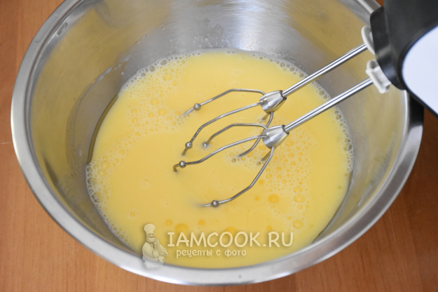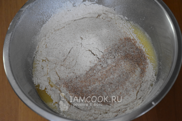 В миску просеять 2 вида муки с разрыхлителем, перемешать венчиком.