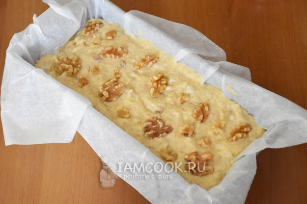 Выложить тесто в форму с пергаментом, сверху выложить оставшиеся орехи и выпекать в разогретой до 180°С духовке 40-45 минут. Остудить на решетке.