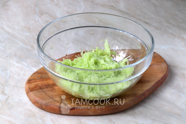 Огурцы очистите от кожицы, промойте и натрите на тёрке со средними ячейками. Затем тщательно отожмите огуречную стружку от лишней жидкости и выложите её в глубокую миску.