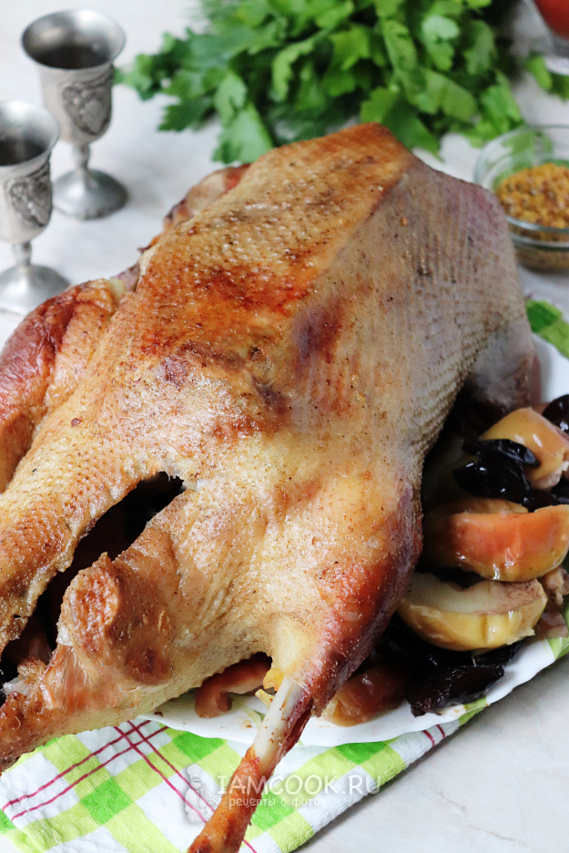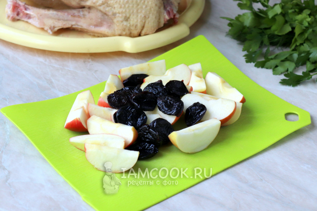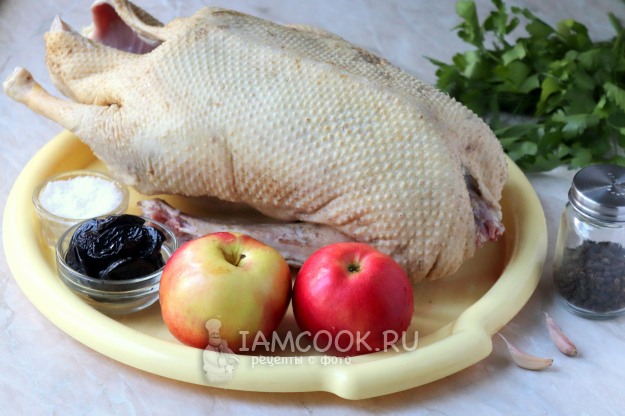 Подготовьте ингредиенты для запекания гуся с черносливом и яблоками в духовке.