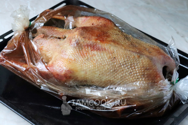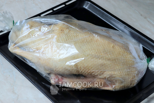 После чего рукав аккуратно разрезать и полить мясо вытопившимся жиром. Запекать ещё 30-40 минут до румяной корочки. Точное время приготовления будет зависеть от веса и возраста птицы. Готовность можно проверить, проколов ножом возле ножки, выделившийся сок должен быть прозрачным, а лезвие должно легко проходить.