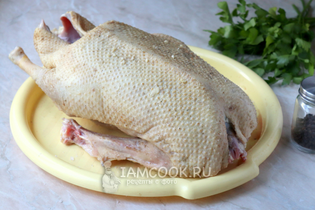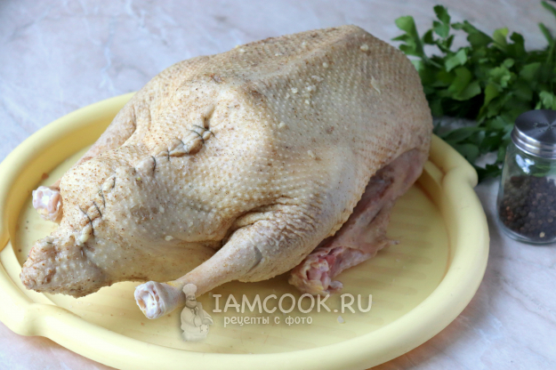 Гуся тщательно помыть под холодной проточной водой. С помощью пинцета удалить остатки перьев и колодочек, в том случае если такие имеются. После чего птицу насухо вытереть бумажным полотенцем и щедро натереть специями и снаружи, и внутри. Кроме соли и чёрного молотого перца, также можно использовать любую приправу для мяса/птицы. Очищенный чеснок пропустить через пресс и промазать чесночной кашицей кожу птицы.