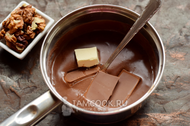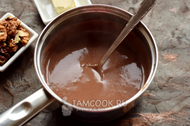 Затем добавьте шоколад и сливочное масло, тщательно перемешайте до полного растворения компонентов.