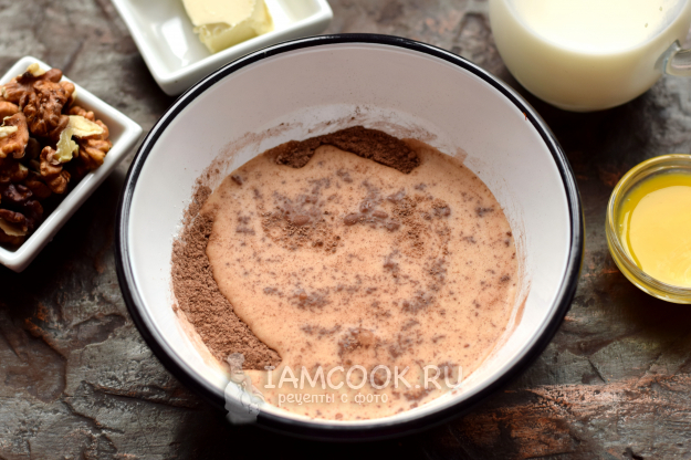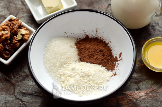 В глубокую тарелку всыпьте все сыпучие компоненты — какао-порошок, сахар, муку, тщательно перемешайте.