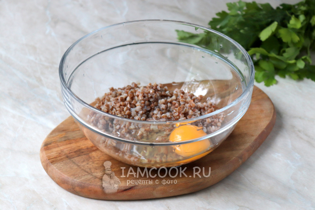 Готовую гречневую крупу переложите в миску. Вбейте куриное яйцо и добавьте по вкусу соль. Тщательно перемешайте.