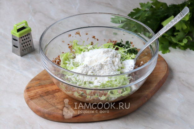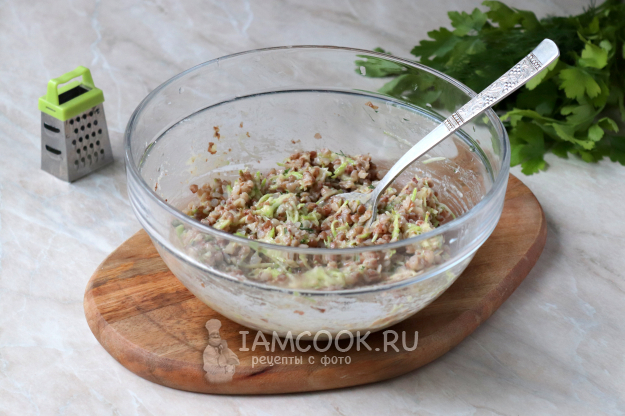 Молодой кабачок помойте и натрите на тёрке со средними ячейками, лишнюю жидкость выдавите. Если кожура слишком твёрдая, лучше её очистить.